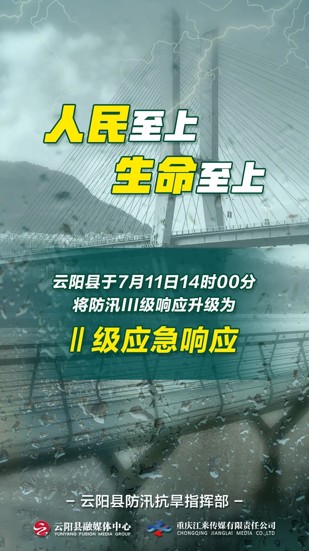 7月10日22时-11日13时,我县出现暴雨到大暴雨天气,其中最大雨量出现在鱼泉镇374.5毫米(特大暴雨),最大小时雨量67.6毫米(平安镇牛门,11日03时)。过去1小时最大雨量为51.3毫米(鱼泉镇)。经会商研究,决定于7月11日14时00分将防汛Ⅲ级响应升级为Ⅱ级应急响应。